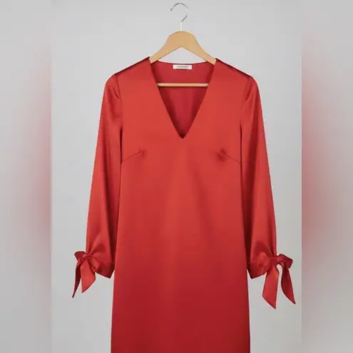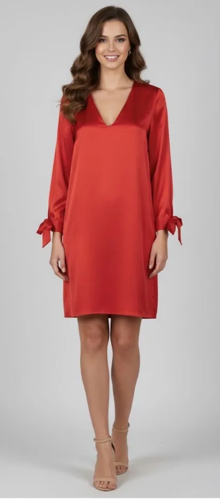 Brand: Belongsci Size: Large (L) Material: High-Quality Satin Finish (Satinado suave) Color: Bold Red Features: Straight Shift Cut: A clean, rectangular silhouette that offers a relaxed and elegant fit without a defined waistline. V-Neckline: Classic and sophisticated front design. Statement Tie-Cuff Sleeves: Long sleeves with built-in fabric bands to create beautiful, adjustable bows at the wrists. Easy Wear: Simple pull-on styling for a seamless look. Fabric: Vibrant red satin with a luxurious sheen, perfect for holiday parties, cocktails, or special events. Measurements (Laying Flat): Length (Largo): 35" Pit to Pit (Sisa a sisa): 21" NWOT