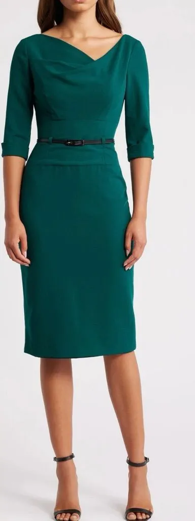 New without tags, never worn Size 0 Color GARDEN GREEN A subtle update to the brand's signature design, this fine gabardine sheath dress is tailored in a sophisticated, three-quarter sleeve silhouette with fitted and figure-flattering appeal Asymmetrical draped neckline Three-quarter length sleeves Vented turn-back cuffs Banded waist with belt loops Removable leather waist belt Square back Back zip closure Center back vent Partially lined About 42" from shoulder to hem Polyester/rayon/spandex Dry clean Made in USA Tags: Influencer Statement Piece, bridesmaids, black tie, gala, formal wear, prom, homecoming, pageant, wedding guest, bridal, wedding, bridal shower, mother of the bride, mother of the groom, rehearsal dinner, bachelorette, pageant, prom, homecoming, wedding, engagement photos, special occasion, little black dress, gala, Graduation, holiday parties, pageant, Quinceañera, formal, black tie, cocktail, Maid of honor, Special occasion, Designer Event, Dinner gown, Photo shoot, Formal event, Celebrity Red Carpet Luxe Luxury, Holiday, Vacation Resort wear, Beach dress, Spring, Summer, Fall, Winter, viral