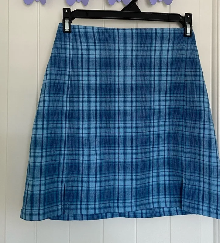 Women’s Brandy Melville Cara skirt. Skirt is blue plaid patterned. Has two slits in the front as sho... Show more