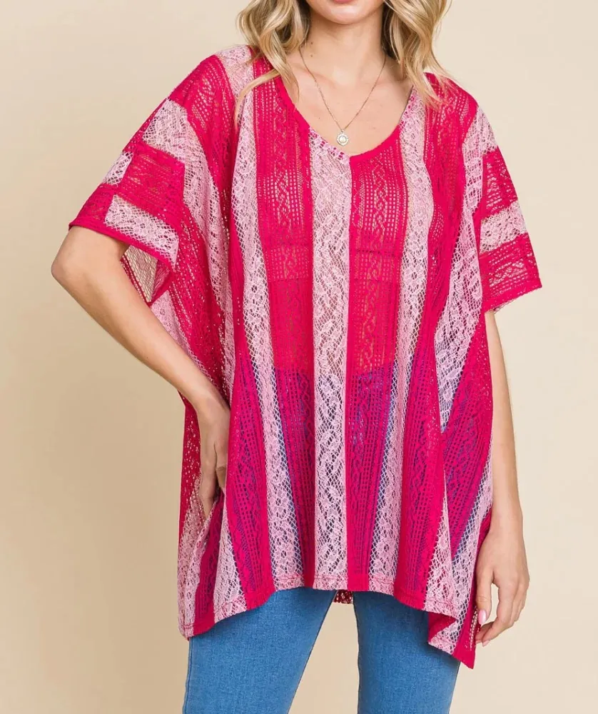 A V-neck drop shoulder oversized top is a trendy and relaxed piece that offers a modern silhouette and comfortable fit. The V-neckline adds a touch of femininity to the oversized style, creating a flattering look. The drop shoulders contribute to the relaxed and slouchy feel of the top, making it an effortless and casual option for various occasions. The oversized fit provides comfort and allows for easy layering. This type of top can be styled in different ways, whether paired with skinny jeans for a laid-back vibe or tucked into a skirt for a more polished outfit. Embrace the chic and comfortable aesthetic of a V-neck drop-shoulder oversized top to elevate your everyday style. Features: Lace Detail, Slit Sheer: Opaque Stretch: No stretch Material composition: 80% polyester, 20% cotton Care instructions: Machine wash cold. Tumble dry low. Made in: Imported Product measurements: S: bust 35 in, length 26.5 in 2