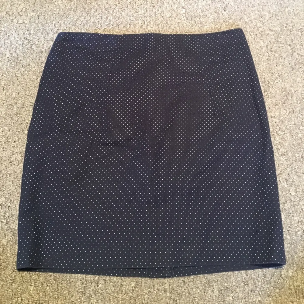 Navy blue with white polka dots. Zipper back. There's also a slit in the back that comes sewed, its... Show more