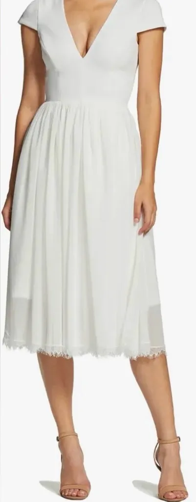 New without tags Size medium Color white You'll be ready to twirl out onto the dance floor at the first downbeat in this crepe dress featuring a chiffon skirt with loads of flair. 42" length (size medium) Hidden back-zip closure V-neck Cap sleeves Lined 97% polyester, 3% spandex bodice with 100% polyester skirt Dry clean or machine wash, line dry Imported Tags: Influencer Statement Piece, bridesmaids, black tie, gala, formal wear, prom, homecoming, pageant, wedding guest, bridal, wedding, bridal shower, mother of the bride, mother of the groom, rehearsal dinner, bachelorette, pageant, prom, homecoming, wedding, engagement photos, special occasion, little black dress, gala, Graduation, holiday parties, pageant, Quinceañera, formal, black tie, cocktail, Maid of honor, Special occasion, Designer Event, Dinner gown, Photo shoot, Formal event, Celebrity Red Carpet Luxe Luxury, Holiday, Vacation Resort wear, Beach dress, Spring, Summer, Fall, Winter