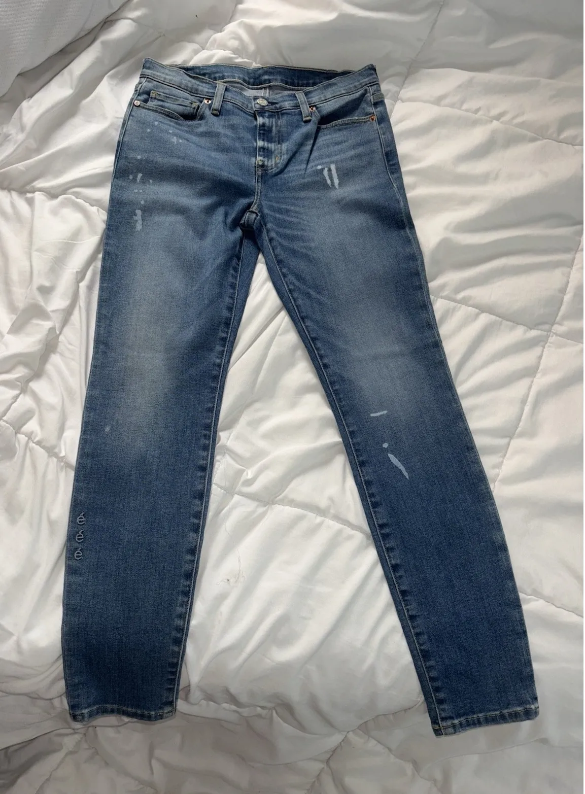The product is a pair of Etica Lily mid rise skinny ankle jeans in size 26. They feature a solid blue color with intentional paint splatter for a unique look. Made from a cotton blend denim with a light fabric wash, these jeans have a zip and button closure, mid rise waist, and a slim fit. The jeans also include accents like buttons, zippers, and a logo detailing, and come with pockets for added functionality. Perfect for women looking for a stylish and on-trend pair of denim pants.