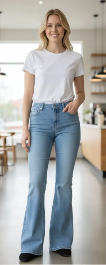 Mid rise; Light wash Five pocket styling; Belt loops; Button and zip fly '70s flare leg