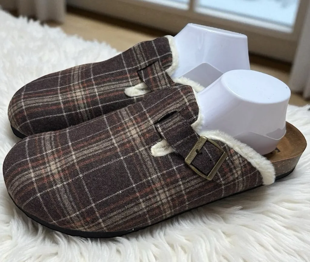 NWOT Fitory Plaid Mule Slip Ons Cork Footbed Cozy Cabincore Holiday Women’s 12 Brown - $25 - From Casey