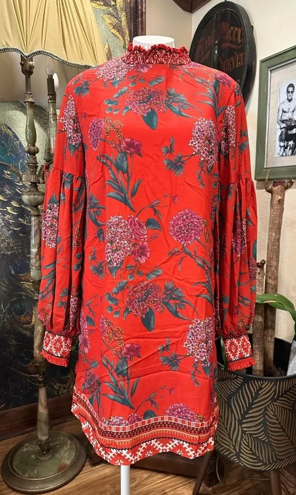 This vibrant red bohemian dress by Flying Tomato features a chic mock neck and elegant bishop sleeve... Show more