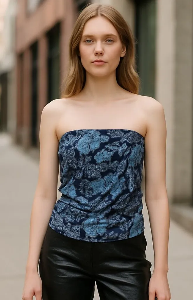 Free People Ruched Bandeau Top in Blue Floral Paisley