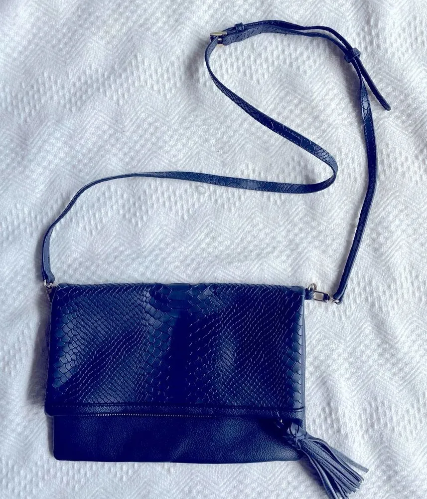 Gigi New York navy blue python embossed leather fold over clutch, with a detachable crossbody/shoulder strap. Gold hardware and an oversized fringe tassel on the zipper. The interior is lined in navy blue fabric. There are no other internal pockets. Designed to also serve as a laptop/tablet case when unfolded. New without tags, never worn. Please see pics for approximate measurements.