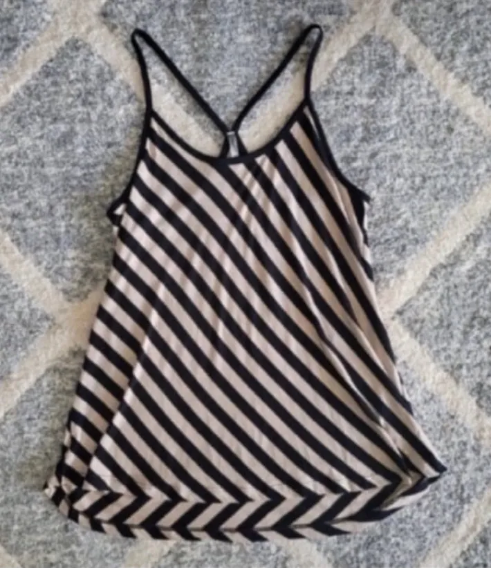 A super comfy beige and black diagonal-striped racerback cami. This stretchy top is fitted at the top but flares at the bottom. Would go perfect with jeans or leggings to run quick errands. Can be dressed up or casual. New without tags (NWOT) Brand: Heart & Hips Size: Small Material: Polyester 48%, Rayon 48%, Spandex 4% Flat Measurements (Approximately) Bust: 16.5 inches Full length: 21 inches