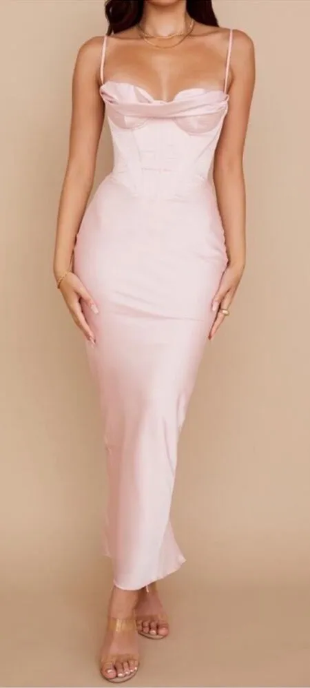 epitome of elegance ano class, made from a lustrous silk satin in a pretty pink hue and cut on the bias to gently skim your figure. It has a beautifully draped cowl neckline and the bodice features our incredible corsetry boning to cinch the figure in. The pretty half cups are softly lined and underwired for full support and uplift, framed by delicate shoulder straps that adjust for the perfect fit.