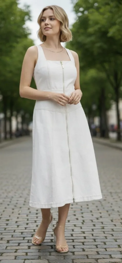 mported * Fitted through the chest and waist; structured A-line skirt sits slightly over hips * Square neck; A-line silhouette * Front zip closure * Sleeveless * Contrast seam detailing throughout * Unlined