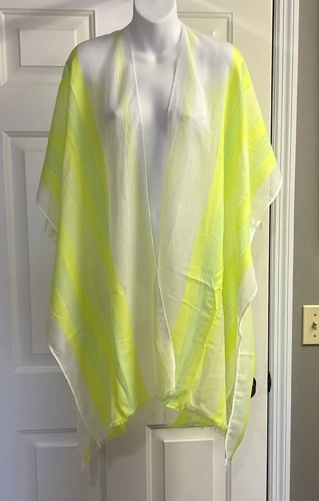 Never worn Women’s- OS Flowy and airy Arm holes are large for comfortable feel White with Neon Yellow and Green Striped Frayed at the bottom Material- 69% polyester and 31% acrylic