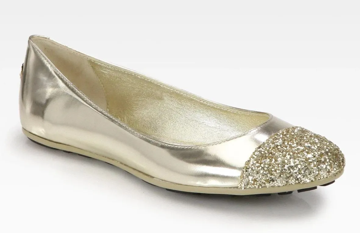 NWOT JIMMY CHOO ‘Whirl’ Champagne Glitter Toe Ballet Flats Silver Silver, glitter ballet flats Mirror leather upper Rubber, logo'd sole Padded insole NEW WITHOUT TAGS/BOX Size 40.5 (US 10)