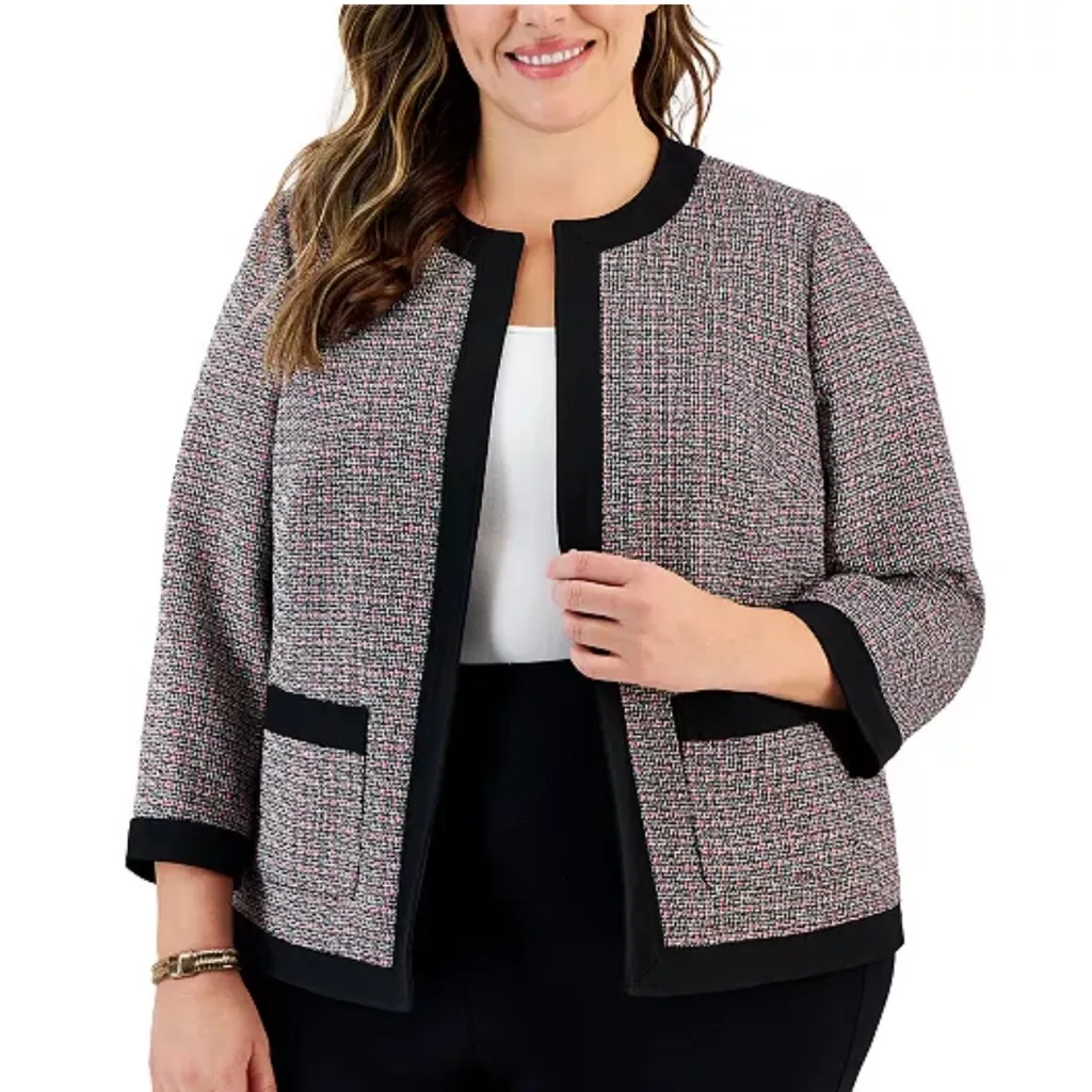 Collarless; open front Contrast-trim frame at neckline and center placket Contrast-trim patch pockets at hip 3/4-sleeves Lined Shell: polyester/metallic; lining: polyester Dry clean In excellent condition.new without tags If any flaws it will be shown on pictures so please see all pictures Measurements below Material & Care tag also on pictures Any questions pls ask me. Bundle to save and offers are welcome :) Measurements Are Approximate: •Size: 16W •Pit to pit: 23” •Length: 26” •Shoulder to Shoulder: 16 1/2” •Sleeves Length: 20 1/2” For Fit Please Compare Measurements To An Item You Have In Your Closet Color may vary due to camera lightings & different computer screens. Minimalist, closet staple, capsule wardrobe, closet essentials, versatile