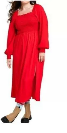 Vibrant red maxi dress by La Ligne featuring a smocked bodice and long sleeves. Made from a blend of polyester and spandex, this dress offers a comfortable fit with its elastic stretch. Perfect for a variety of occasions, it combines style and ease-of-care with machine washability.
