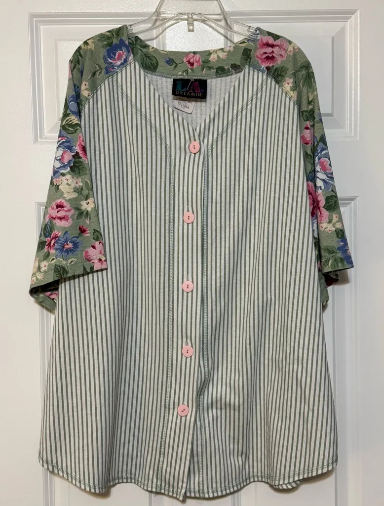 NWOT L.A. Nights 90s Vintage Green Floral Stripe Button Up Baseball T-shirt Size 22 50% polyester, 50% cotton Mixed print - floral & stripes Pink buttons down the front Excellent condition; please see all photos for items exact condition. Color(s) may vary depending on screen resolution. Smoke free home. Please feel free to ask any questions prior to purchase. ❀