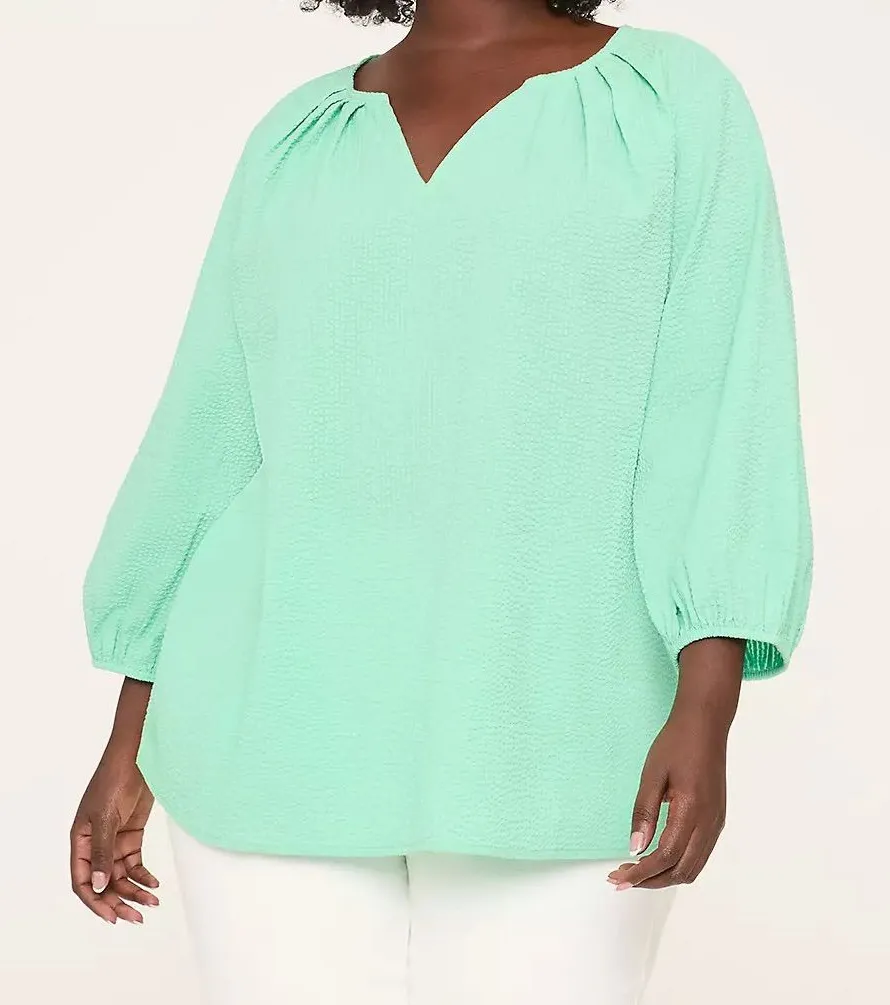 Relaxed. An easy silhouette that fits away from the body. Notch neck with pleated detail 3/4 sleeve... Show more