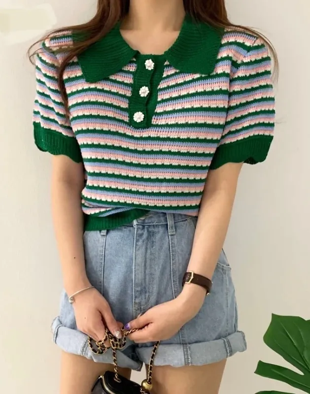 NWOT Loose Knit Green & Pink Stripped Sweater With White Flower Buttons Size M Size M - $40 New With Tags - From Liv