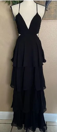 Lulus Tier and Now Black Tie-Back Maxi Dress Woven chiffon forms a V-neckline, fitted bodice, and slender straps that tie at the back above a keyhole cutout. The tiered maxi skirt completes the look with a hidden back zipper. New without tags never worn Size tag cut by store to prevent return Bin I Lulus Tier and Now Black Tie-Back Tiered Maxi Dress