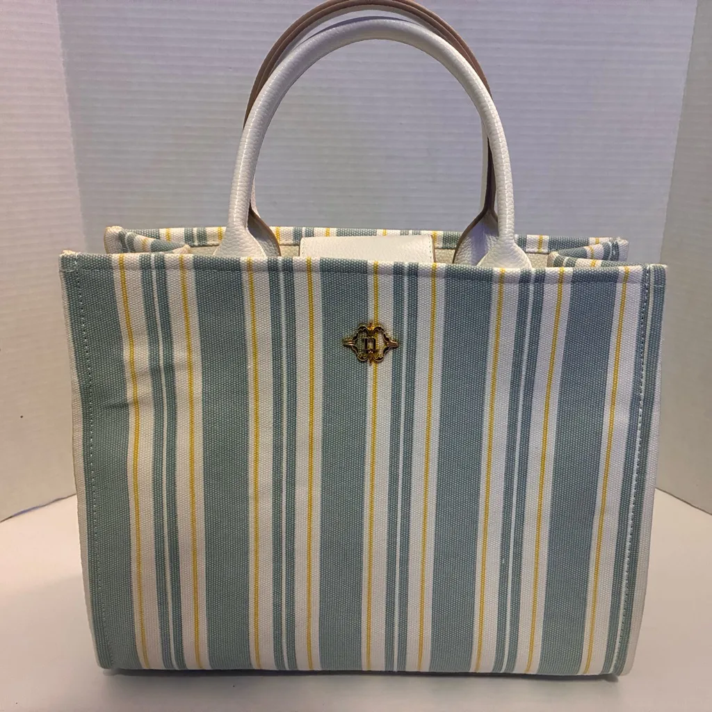 Stylish striped tote bag featuring elegant white and yellow accents. Featuring shoulder straps or an... Show more