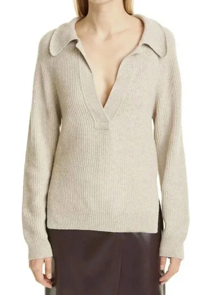 Nanushka Bambi Beige Wool Polo Sweater Color: Latte (light tan) Size: XS Long sleeve stretch brushed knit wool and alpaca-blend sweater in beige. Vented placket at spread collar. Rib knit. Pet-free, smoke-free home. NEW WITHOUT TAGS - NEVER WORN Ships quickly!