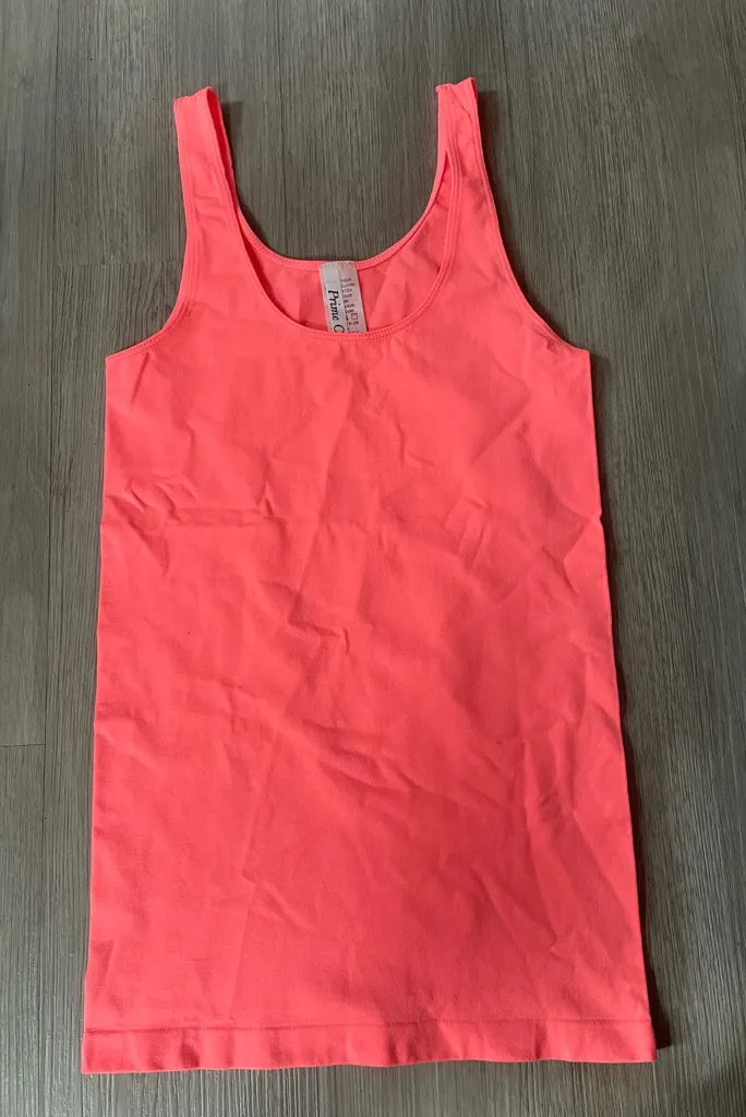 Prime Cut neon coral tank top in a stretchy nylon spandex blend for a smooth, fitted look. Bright and bold, perfect for layering, summer outfits, or Y2K-inspired styling. Scoop neck with a classic sleeveless cut. Tagged one size, best fits small to medium depending on desired fit. New without tags