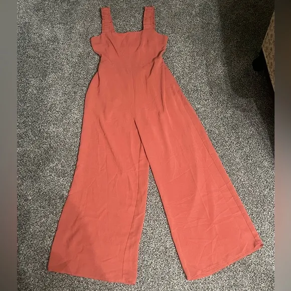 New without tags (came off when I washed it) Sadie and Sage burnt coral/spice colored Make It Up Cut Out jumpsuit sleeveless Has pockets Square neckline Smocked lace back with an elastic waistband to make it stretchy Medium 100% polyester Approximate length=55 3/4 in Approximate pit to pit= 16 in Approximate hip to hip=22 5/8 in Approximate inseam=27 in Great condition, has a small black spot on the front (see last pic) Feel free to create a bundle or shoot me an offer! Smoke free, 1 dog home **might arrive wrinkly**