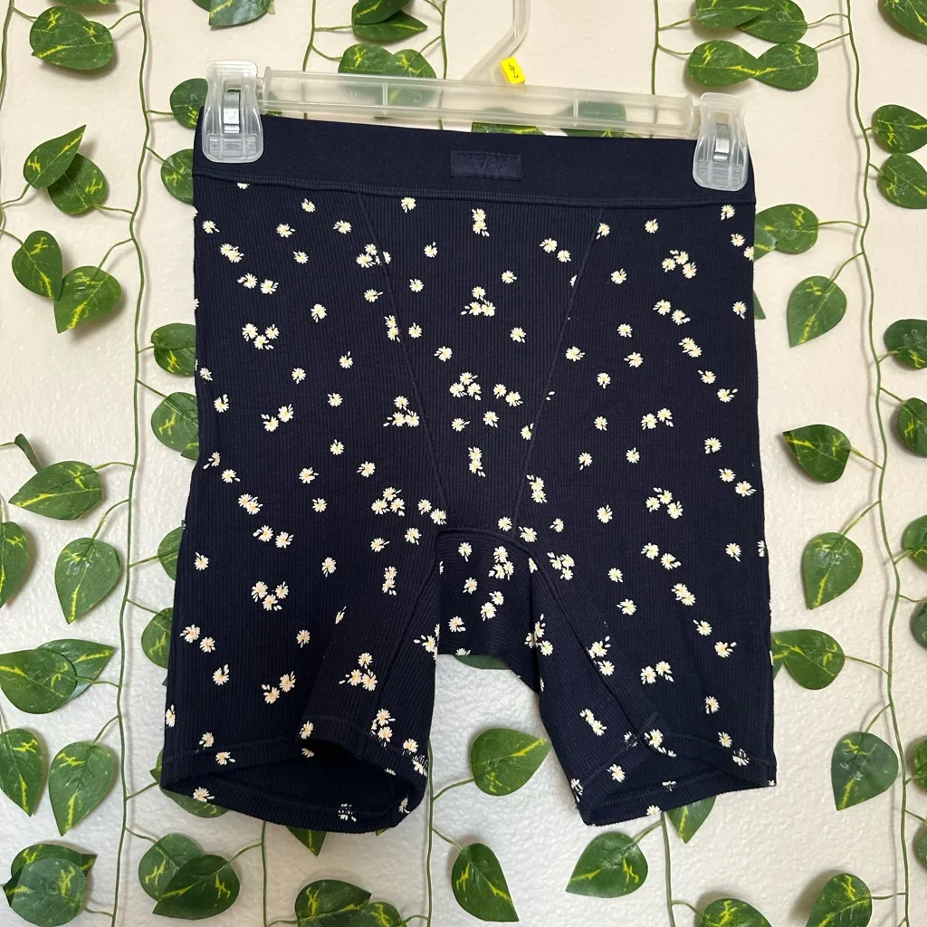 These NWOT SKIMS cotton Ribbed Biker Shorts in navy with a floral print are a stylish and versatile addition to your wardrobe. The pull-on closure and machine washable material make them easy to wear and care for, perfect for casual occasions during the summer and spring seasons. The biker style and flat front design give them a trendy look, while the blue color and floral print add a feminine touch. With the skims brand logo as an accent, these shorts offer both fashion and comfort for women in size XS. New the tag fell off Smoke free home