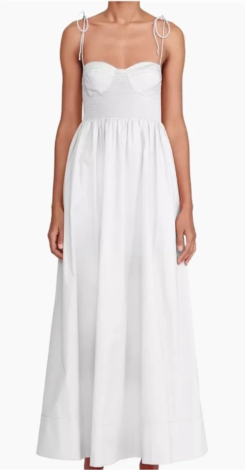 New without tags Size L Color white STAUD's Landry maxi dress is designed with adjustable shoulder ties and a smocked bodice complemented by a flared skirt. Sweetheart neck Adjustable shoulder ties Pullover style 98% cotton/2% spandex Dry clean Imported SIZE & FIT About 49.5" from shoulder to hem Model measurements: 5'10" tall Tags: Influencer Statement Piece, bridesmaids, black tie, gala, formal wear, prom, homecoming, pageant, wedding guest, bridal, wedding, bridal shower, mother of the bride, mother of the groom, rehearsal dinner, bachelorette, pageant, prom, homecoming, wedding, engagement photos, special occasion, little black dress, gala, Graduation, holiday parties, pageant, Quinceañera, formal, black tie, cocktail, Maid of honor, Special occasion, Designer Event, Dinner gown, Photo shoot, Formal event, Celebrity Red Carpet Luxe Luxury, Holiday, Vacation Resort wear, Beach dress, Spring, Summer, Fall, Winter, viral