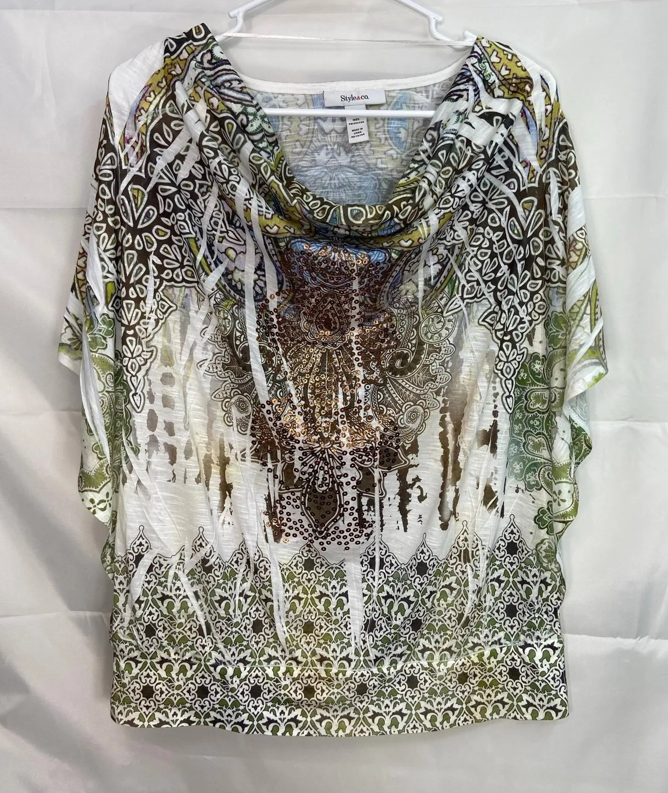 Style & Co women's green white floral tie dyed faux sequin loose blouse Size large In new without ta... Show more