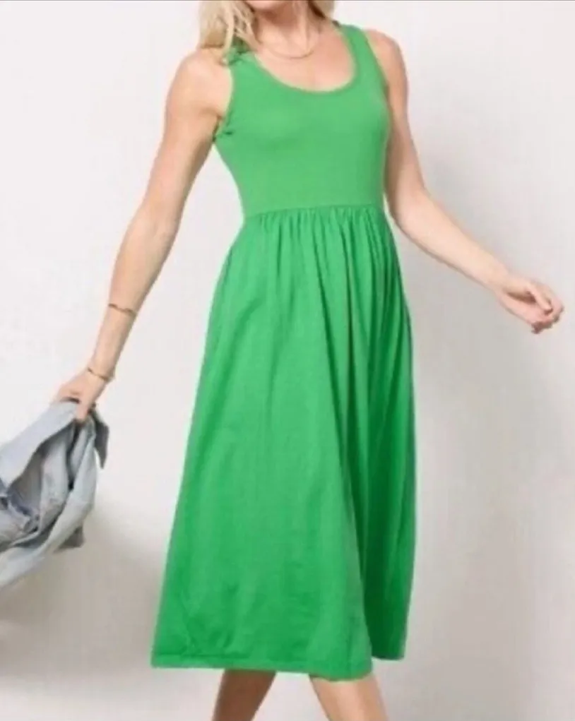 Bright green dress by Sundry. Crafted in the USA. Size XS. Top part is ribbed. Stretchy fabric. Has pockets!! I would stick to a xs or a smaller side of a s. I’m a small sometimes medium and it was a little tight. From a dog friendly home New