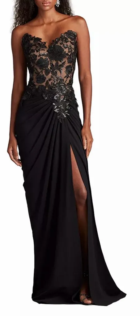 New without tags Size 4 Color black /nude Floral embroidery and lustrous sequins make a glamorous combination on this statuesque gown made with a draped-and-gathered skirt that pools in the back and shows off a leg-baring side slit. 60" length Hidden back-zip closure Strapless Side slit Lined 80% polyester, 20% nylon Dry clean Imported Item #10699228 Tags: Influencer Statement Piece, bridesmaids, black tie, gala, formal wear, prom, homecoming, pageant, wedding guest, bridal, wedding, bridal shower, mother of the bride, mother of the groom, rehearsal dinner, bachelorette, pageant, prom, homecoming, wedding, engagement photos, special occasion, little black dress, gala, Graduation, holiday parties, pageant, Quinceañera, formal, black tie, cocktail, Maid of honor, Special occasion, Designer Event, Dinner gown, Photo shoot, Formal event, Celebrity Red Carpet Luxe Luxury, Holiday, Vacation Resort wear, Beach dress, Spring, Summer, Fall, Winter, viral
