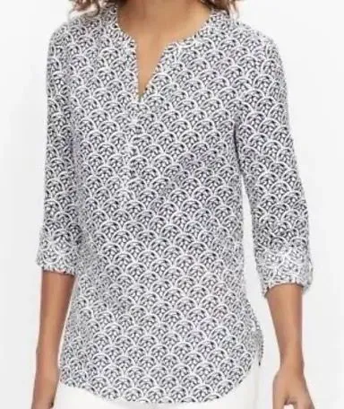 NWOT Talbots 100% linen popover shirt tile ikat print Blue White Geometric Blouse