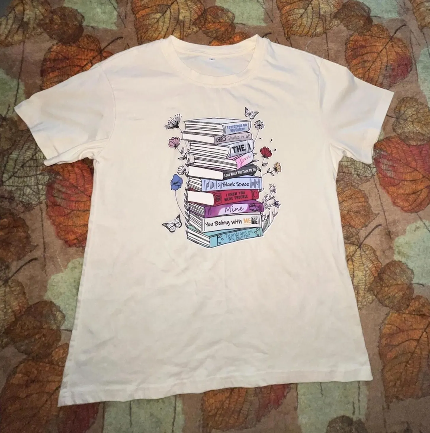 This New With Out TagsTaylor Swift fan t-shirt is a must-have for any Swiftie and book lover! The unique graphic features a stack of colorful books, with titles like "THE 1", "Mine", "Blank Space", and "You Belong With ME" referencing classic songs across different Taylor Swift albums. This design is often referred to as the "Eras Library" or "Albums as Books" shirt, making it a highly keyword-relevant item for online marketplaces. This medium-sized tee is perfect for everyday wear, a concert outfit, or as a collectible item for dedicated fans. The vibrant print is durable and designed to last, aligning with the current trend of sustainable, long-lasting fan apparel. Size: Medium #SwiftieStyle #ErasTourMerch #TaylorSwiftFashion #BookwormAesthetic #SustainableFanWear