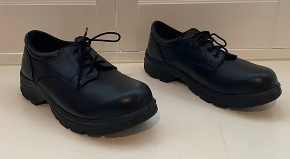 . These black leather oxford shoes feature a classic wingtip design with decorative perforations, offering a sophisticated look. The durable rubber soles are oil and slip resistant and ensure comfort and longevity, making them ideal for formal occasions. With their sleek all-black appearance, these shoes are perfect for professional settings. Only ever tried on and still in excellent condition.