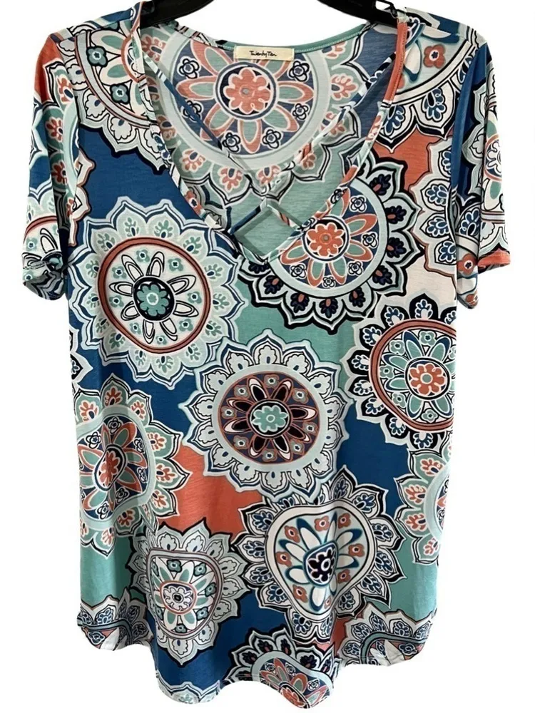 Beautiful Shortsleeve top, with crisscrossed detail on the front. Turquoise with shades of blue and purple with mandala pattern. 96% polyester, 4% spandex. Approximately measuring 21.5in pit to pit, 29in length.