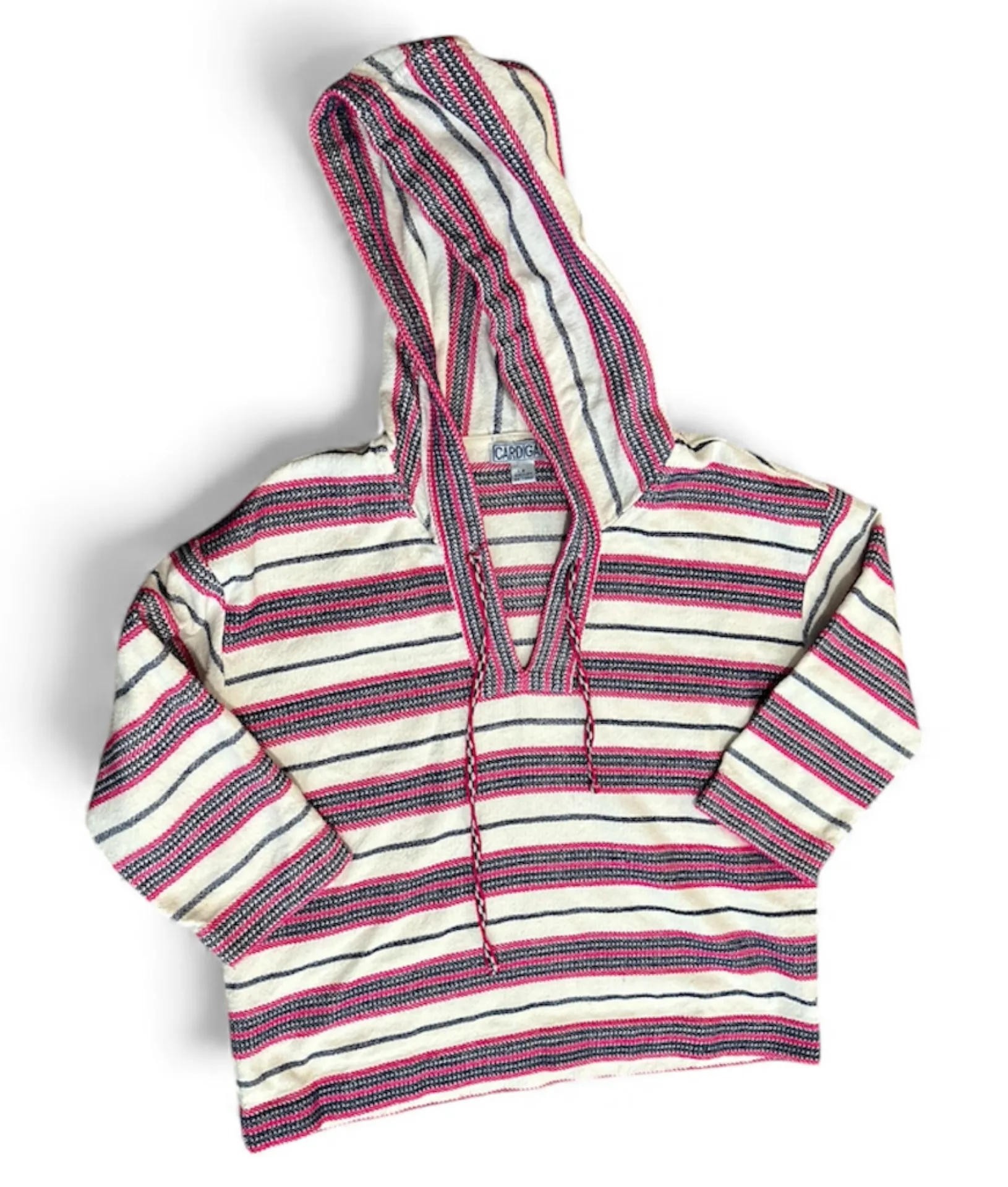 This vintage Baja hoodie, also known as a Mexican "drug rug" or poncho, features a classic striped design in pink, white, and blue. It is a pullover style with an attached hood and V-neck, perfect for a boho or hippie aesthetic. This style is popular for casual, vacation, or festival wear. New without tags! Pit to pit 21” Length 22” Tags: Surf Beach Hippie Boho Bohemian Festival Poncho Pullover Hoodie Sweater Drug Rug Mexican Baja Striped Colorful Vintage 90s Y2K