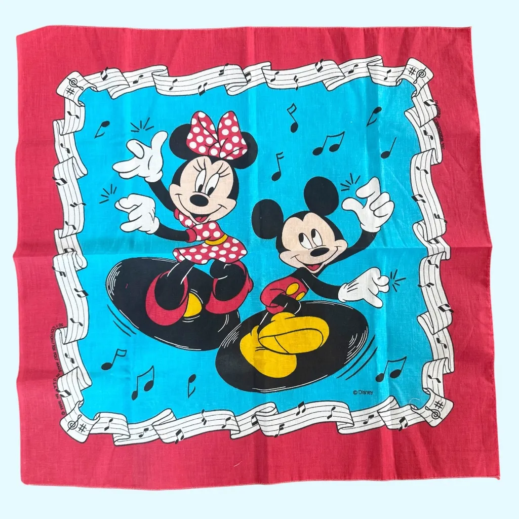 Charming Disney bandana with Mickey and Minnie dancing. Features a red border and blue background. M... Show more