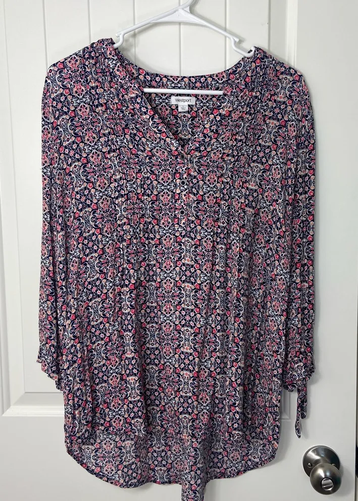 Westport women’s blue pink popover button neck tie sleeve floral blouse Size large In new without tag condition Smoke free home! All items are lint rolled before shipping :) Pit to pit 22 inches, length from shoulder 26 inches