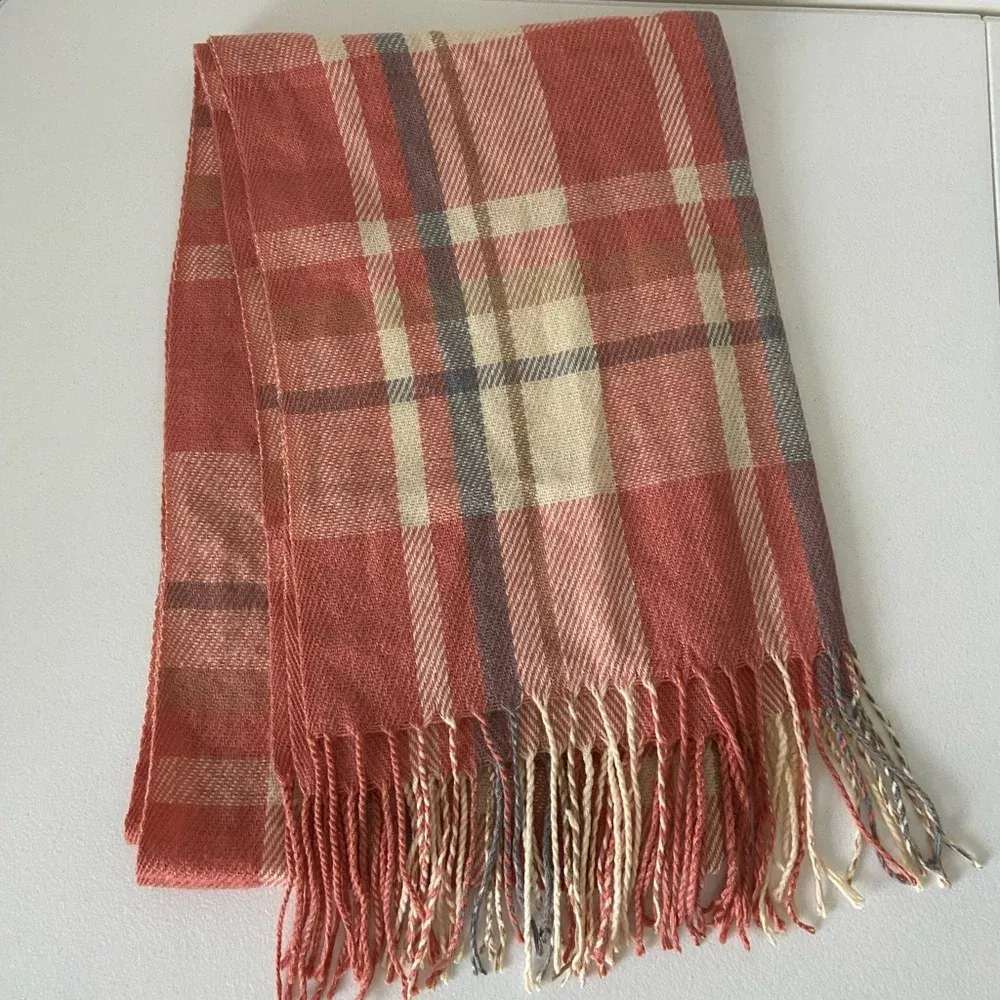 Women’s scarf. Scarf is fall colored with a plaid pattern & tassels on the ends. No brand or material tag, but material is soft & warm! Smoke free home! Measurements: length 69 inches (not including tassels), width 23.5 inches