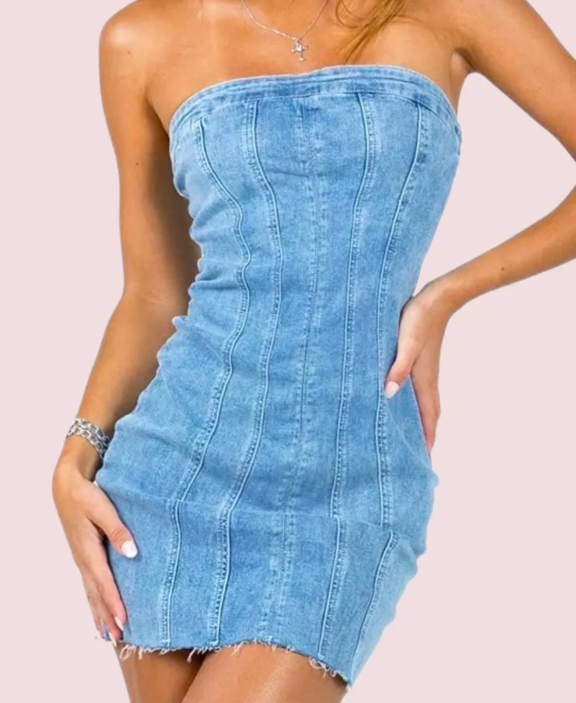 Turn up the heat with this sexy strapless denim mini dress! Featuring a flattering corset-style bodice and bodycon silhouette, this Y2K-inspired tube dress hugs your curves in all the right places. Perfect for nights out, festivals, or edgy everyday wear. • Soft stretchy denim • Structured seams for a snatched look • Frayed hemline adds extra attitude • Zipper back closure • Never worn – no tags attached Style it with boots or heels for a bold, head-turning outfit!