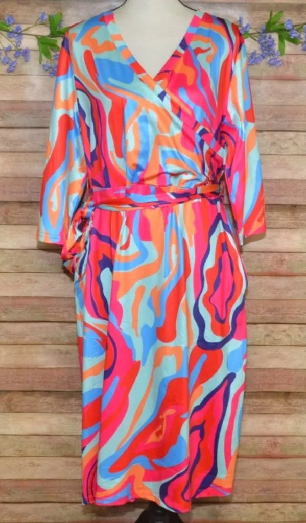 This colorful faux wrap midi sheath dress features a swirling psychedelic pattern, perfect for a retro hippie look. With long sleeves, pockets, and a belted waist, it's designed for comfort and style, offering a stretchy fit that's ideal for any occasion. • Faux wrap design • Psychedelic pattern • Midi length • 60's Costume Dress Up • Belted waist • Stretchy fabric • Convenient pockets Location: Section 28 Please SEE measurements of the clothing items to ensure fit! Measurements are in the last photo. To check measurements, measure a well-fitting garment laying flat unstretched. We double the measurement for bust/chest/waist/hip/thigh and leg opening. Length is measured from shoulder to hem. Inseams are measured along the inseam. When you see TWO measurements for one area it is because the item has stretch and one is laying flat and the other is stretched. 🙂 Size: Womens 3X Condition: Pre-Owned Like New Excellent Condition Thanks for looking at my listing. I have been selling online for several years and take pride in the items that I am listing and feel they will make a great addition to someone's wardrobe or home. All the items I am listing have been checked by several people and do not have any flaws such as holes, rips, or stains. Any issues a piece may have will be disclosed and will be included in the photos. Happy Shopping!