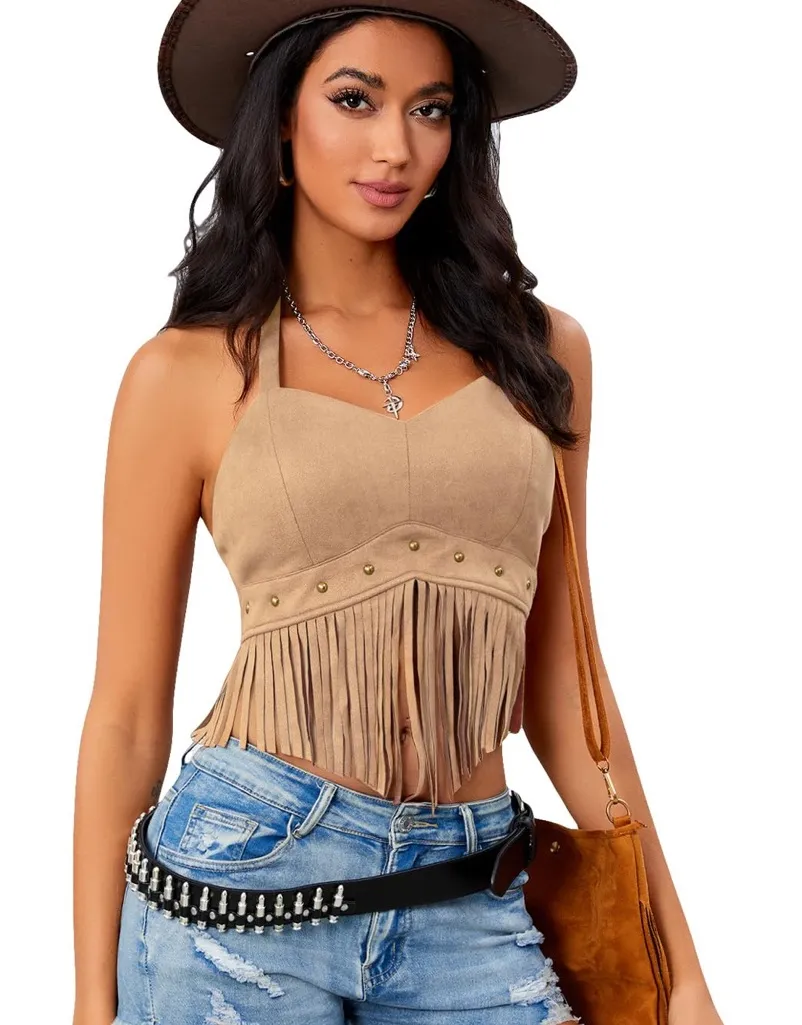 Channel retro cowgirl vibes with this chic faux suede crop top! Features a halter tie design, rivet detailing, and fun fringe tassels for a flirty western-inspired look. Perfect for festivals, concerts, rodeos, or pairing with denim shorts for a Y2K boho outfit. ✨ Details: • New without tags • Faux suede fabric • Fringe tassel hem • Rivet stud accents • Adjustable halter tie • Cropped fit A statement piece for country concerts, Halloween costumes, or everyday western flair!