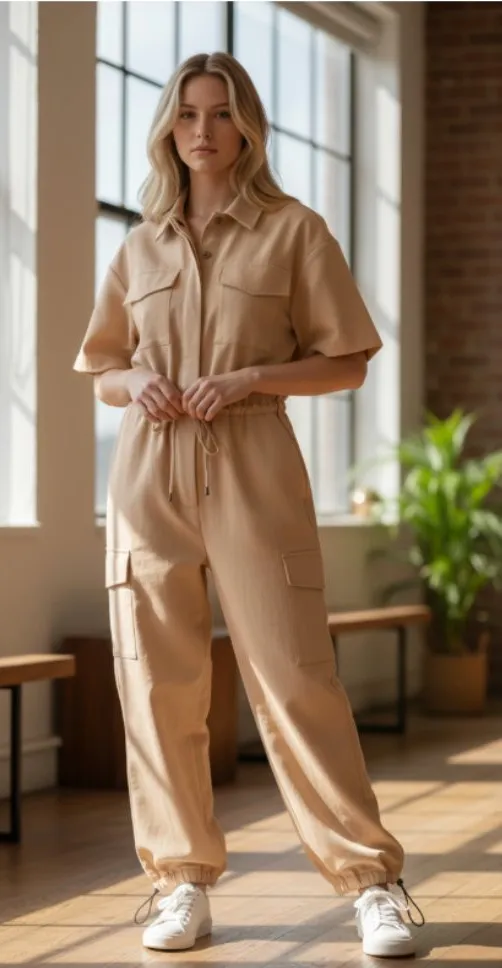 Features Front snap closure Side seam pockets Elastic waistline/hem with drawstring Large pockets on... Show more