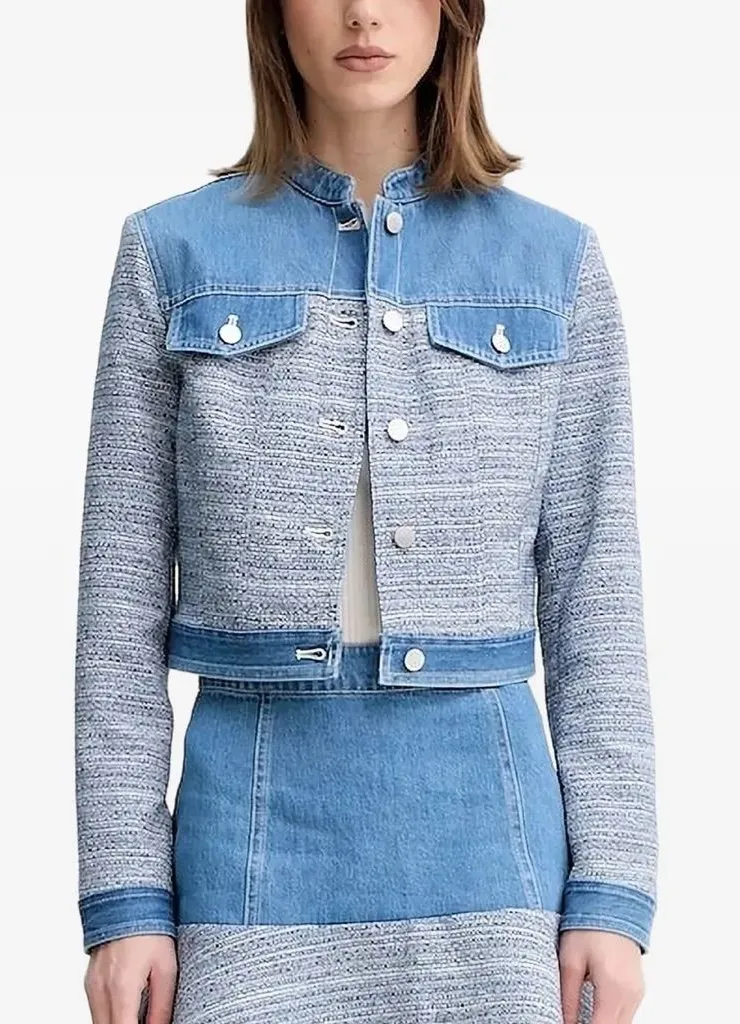 Woven tweed jacket Denim yolk, trim and details Denim standing collar Long sleeves with denim button... Show more