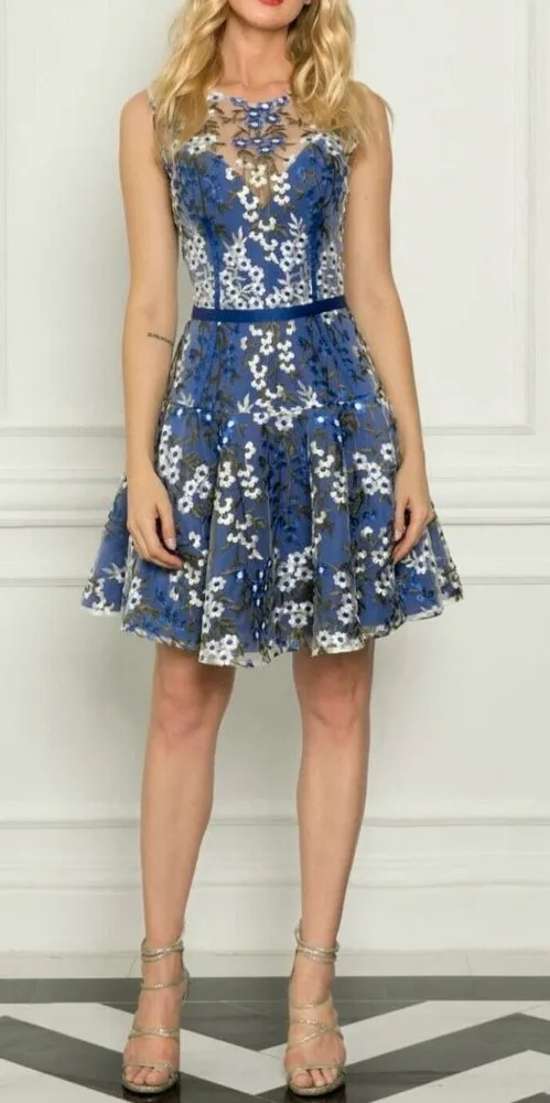 NWT $498 BRONX & BANCO Blue & White Floral Embroidered Mesh Cocktail Dress XS 2 - $280 New With Tags - From Angela