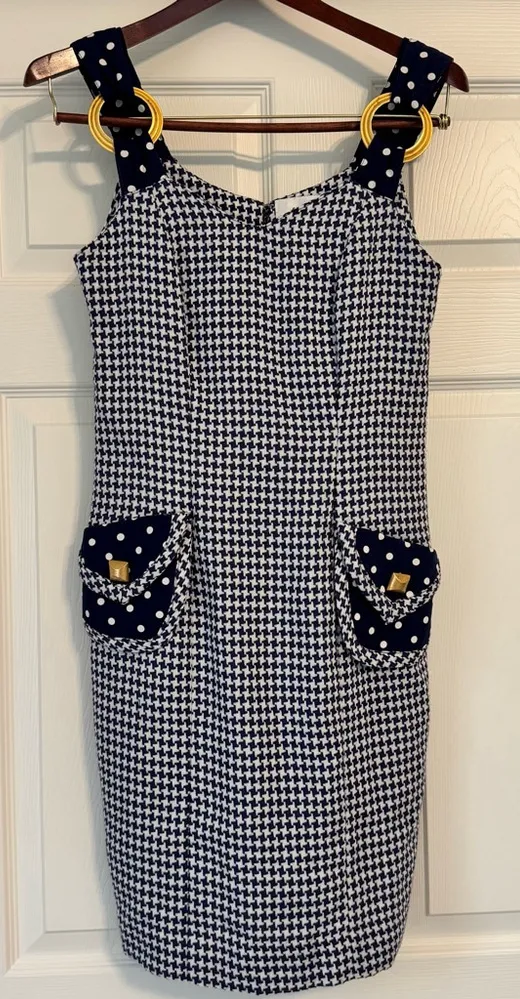 Vintage 90’s - new with tags! Linda Segal dress, size 4. It features a navy and white houndstooth pattern. The dress has a sweetheart neckline and navy straps with white polka dots, accented by gold rings. Two navy polka dot faux pockets with gold square buttons adorn the front. The dress is made of 100% cotton and has a zipper closure in the back. Small amount of stretch in the fabric. Measures approximately 35.5” length from shoulder to hem, bust 16”, waist 14.5”, hip 17”. No flaws noted. Smoke free home.