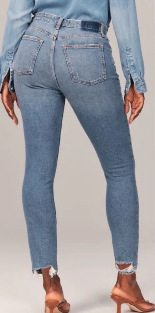 Abercrombie & Fitch Curve Love high rise skinny jeans in medium indigo wash. Stretch denim, frayed h... Show more