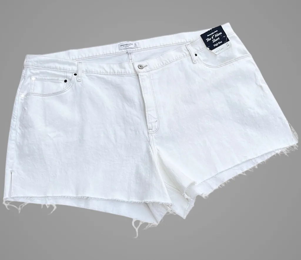 New with tag; Off white cotton/spandex denim; raw edge hem; 4” inseam; “ rise; laying flat waist mea... Show more