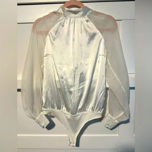 NWT, bodysuit satin feel bodice, sheer sleeves. Adjustable snaps for longer torso. P2P 18” across D... Show more